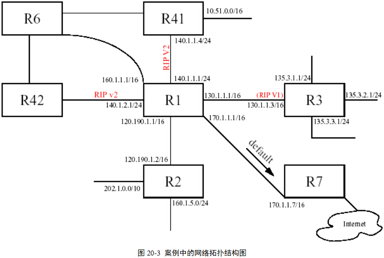 有图20-3网络拓扑结构图,其中图中的路由器R1就是SSR2000路由式交换机。试配置其静态路由表,并将配置后的路由表重新分配到RIP路由协议。