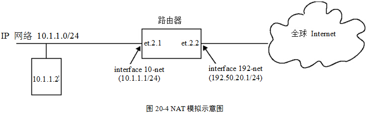 在图20-4中,所用路由器为SSR2000,现需要配置NAT服务,使内网的IP地址10.1.1.2/24在进行外网访问时,被转换为192.50.20.2。