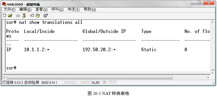 在Enable模式下,输入命令:nat show translation all,将显示所有的转换项目,图20-5