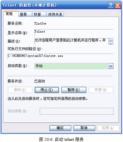 (2)在PC1上执行“开始”|“控制面板”|“管理工具”|“服务”,找到Telnet服务,并将其开启,图20-3。