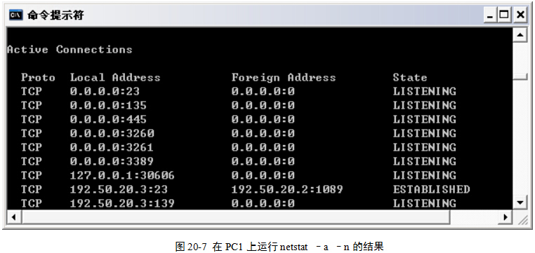 (6)在PC1上打开命令提示符窗口,输入命令:netstat -a –n,查看系统连接情况,图20-7。