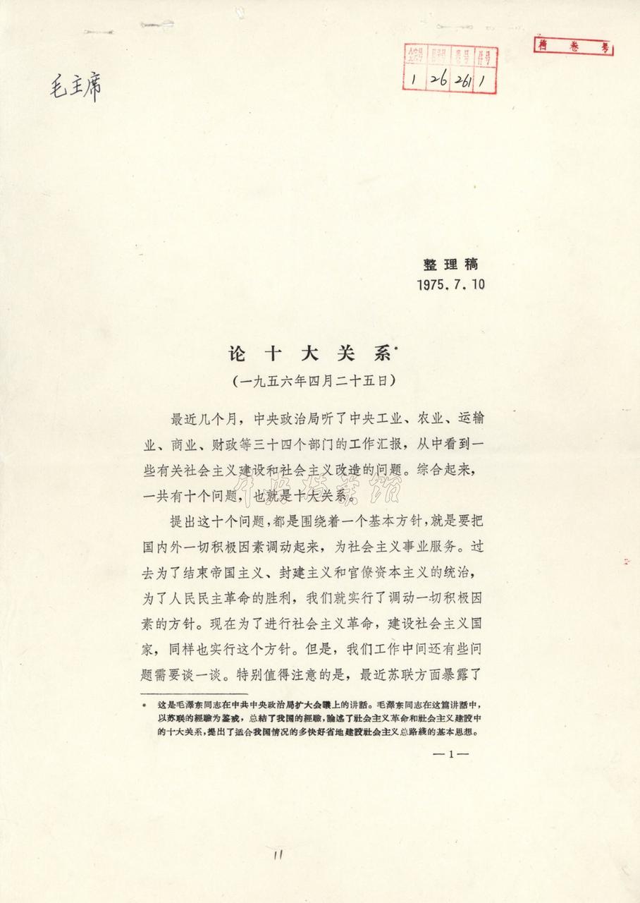 《论十大关系》虽然对我国经济建设有很强的指导意义,但它的发表过程比较曲折。从1958年开始,经济建设受到了“左”的思想的严重干扰。在第三个五年计划开始执行的时候,刘少奇于1965年12月15日写信向毛泽东建议,将这个讲话作为内部文件印发给县、团以上各级党委学习。毛泽东看了这个讲话的整理稿后批复:“此件看了,不大满意,发下去征求意见,以为将来修改之助。”1975年,邓小平主持中央日常工作和《毛泽东选集》第五卷编辑工作期间,向毛泽东提出,将《论十大关系》的两次讲话记录稿进行整理。后来在胡乔木的具体主持下完成了该项工作。整理稿于7月10日送邓小平,13日转送毛泽东。邓小平在给毛泽东的信中说,“《论十大关系》稿,已整理好,我看整理得比较成功”,“我们在读改时,一致觉得这篇东西太重要了,对当前和以后,都有很大的针对性和理论指导意义,对国际(特别第三世界)的作用也大,所以,我们有这样的想法:希望早日定稿,定稿后即予公开发表,并作为全国学理论的重要文献”。当天,毛泽东即审阅了这个稿子,并批示:“同意。可以印发政治局同志阅。暂时不要公开,可以印发全党讨论,不登报,将来出《选集》再公开。”