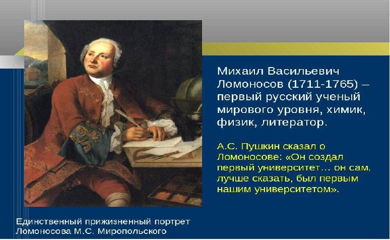 Михаил Васильевич Ломоносов (8 (19) ноября 1711 — 4 (15) апреля 1765, Петербург) — первый русский учёный-естествоиспытатель мирового значения, поэт, заложивший основы современного русского литературного языка, художник, историк, поборник развития отечественного просвещения, науки и экономики, основоположник молекулярно-кинетической теории(分子动力学理论). В его честь назван Московский государственный университет.