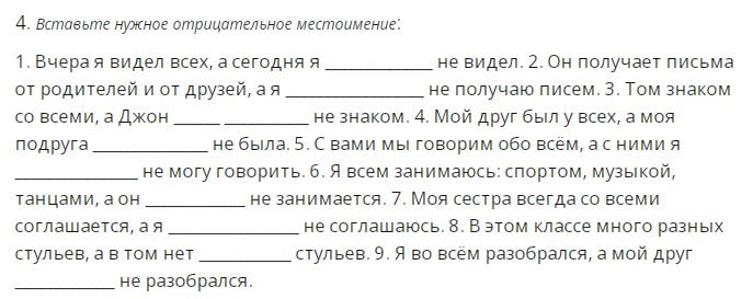 Отрицательные местоимения употребляются в предложении с отрицательным сказуемым. Они усиливают это отрицание: