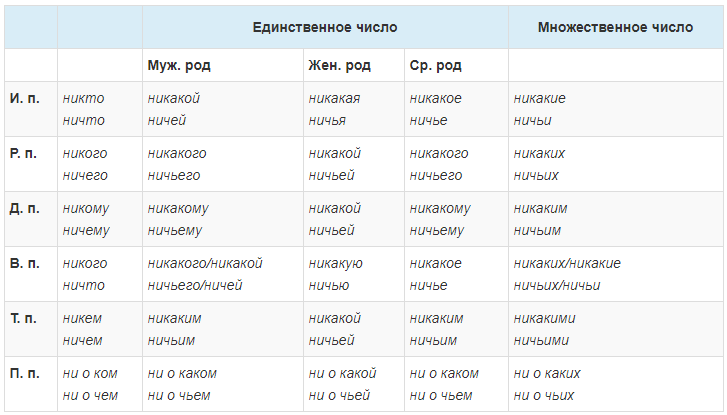 Отрицательные местоимения «никто» и «ничто» не изменяются по родам и числам и склоняются, как и производящие местоимения «кто?» и «что?»: