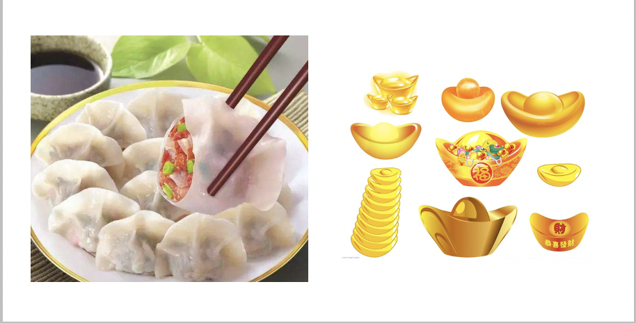 The shape of jiao zi looks like the ancient currency of China called yuan bao. People eat dumplings on the Chinese New Year wishing they will earn more money in coming year.There are many steps to make jiao zi.