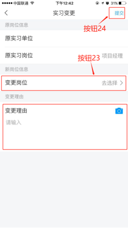 3)变更申请,点击后,即可查看变更申请记录。点击申请(按钮22),选择变更岗位(按钮23),填写变更理由后点击提交(按钮24)。