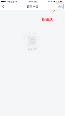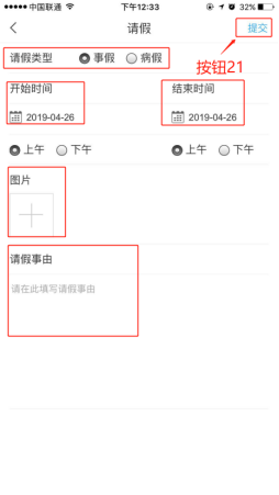 点击请假申请,即可看到请假申请的记录。点击请假(按钮20),进入编辑页面,填写请假类型,时间,图片,事由,然后点击提交(按钮21)。