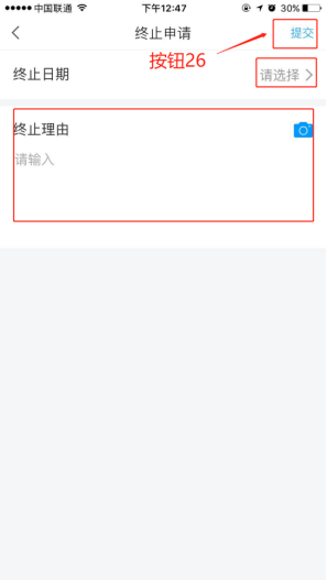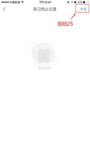 4)终止申请,点击后,即可查看实习终止记录。点击申请(按钮25),选择终止日期,填写终止理由,点击提交(按钮26)。