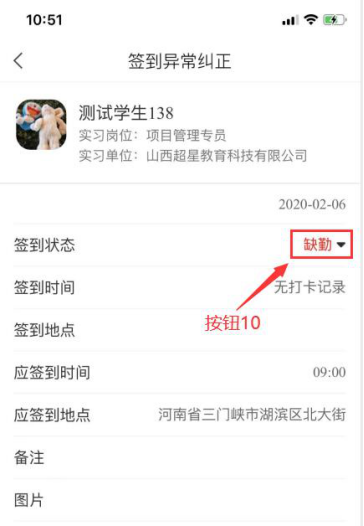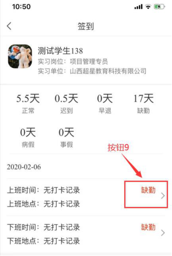 点击签到,点击按钮9可查看签到信息,按钮10可更改签到状态。