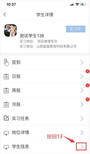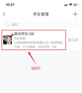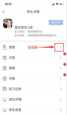 点击任意学生姓名(按钮7),可以看到学生的签到状态(按钮8),日/周/月报,实习任务完成情况,岗位详情及学生信息。