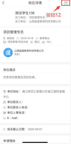 (2)点击岗位详情(按钮11)可查看学生的岗位详细信息,可进行转发(按钮12)。