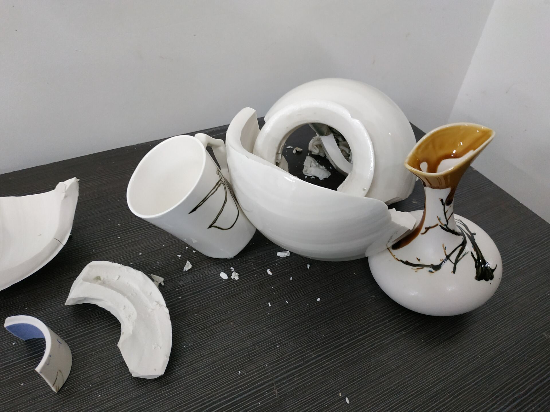 陶瓷坯体发生炸裂,其碎片粘在周围作品上。引起炸坯的因素有:作品内部有气泡、坯体没有干透、窑炉升温速度过快。
