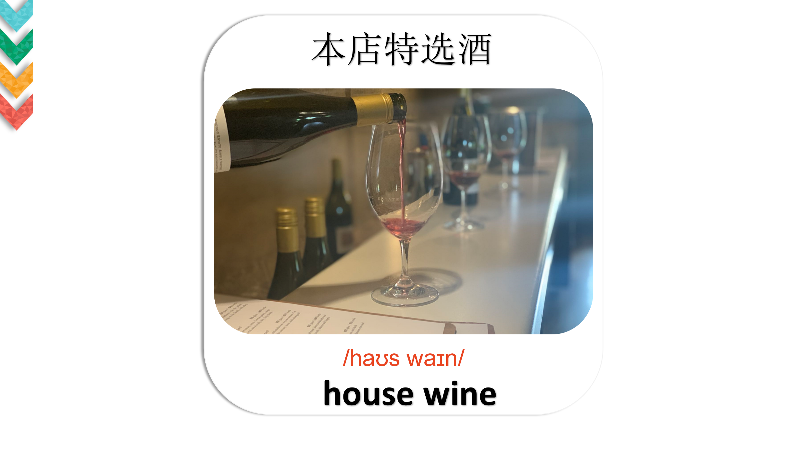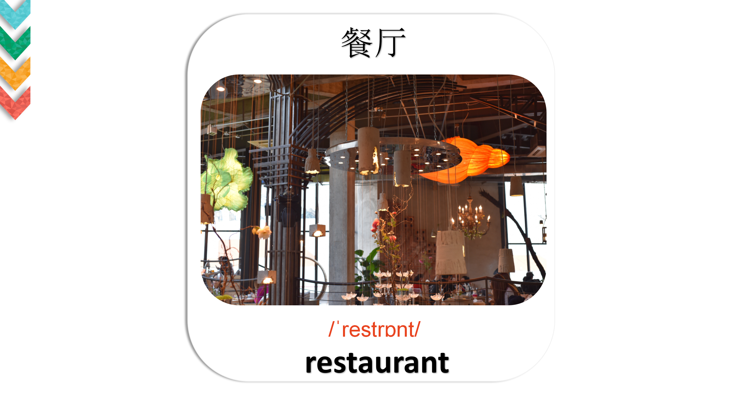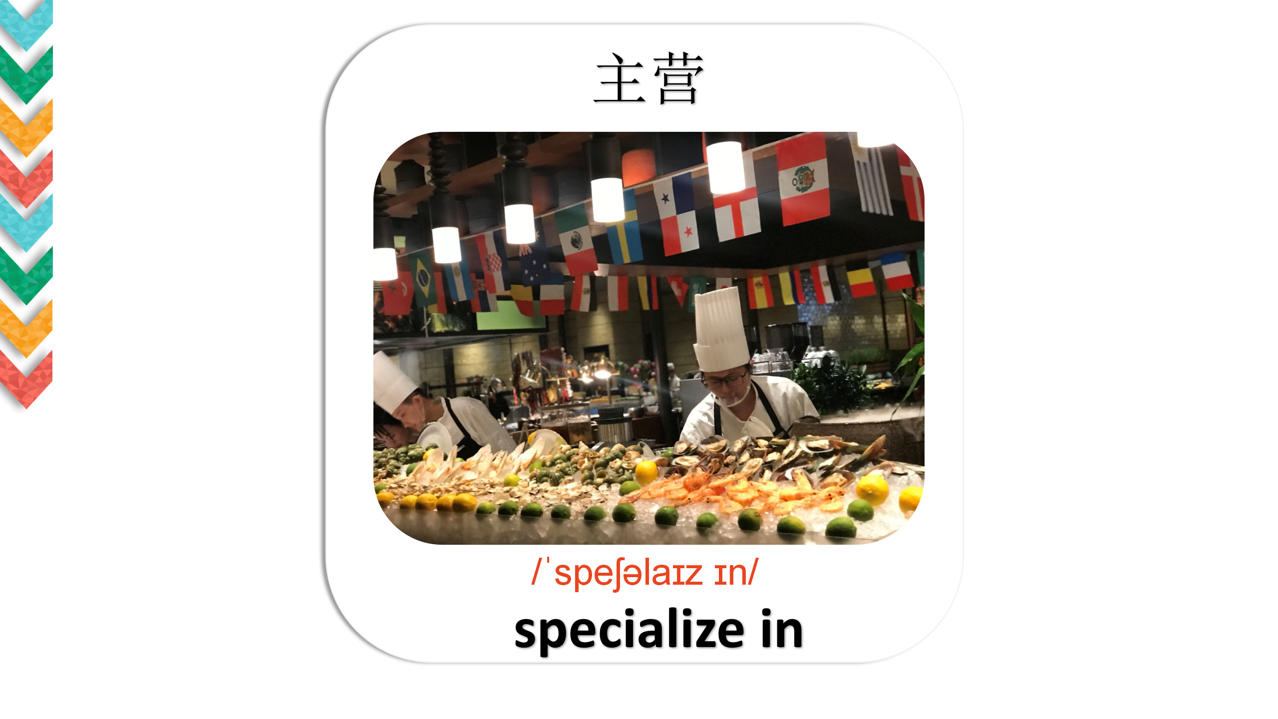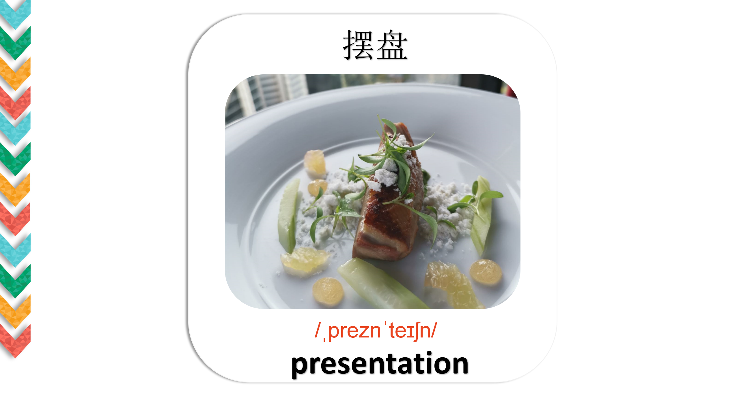 在英语里,厨师对应有2个词汇:一个是 “cook”,另一个是 “chef”。在酒店和餐馆里,称呼主厨或专业厨师用英文词汇”chef”,而在其他时候,普通的厨师则使用英文词汇”cook”。在用餐的过程中顾客会偶尔有机会与 “chef”面对面交流,讨论食材、口味、菜肴做法亦或是处理关于食物的投诉,厨师趁此既维护了宾客关系,也能树立个人的专业与诚信形象。