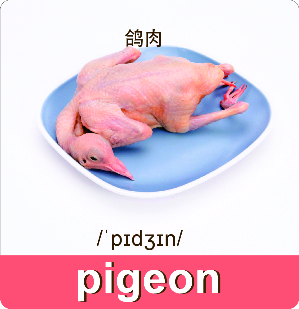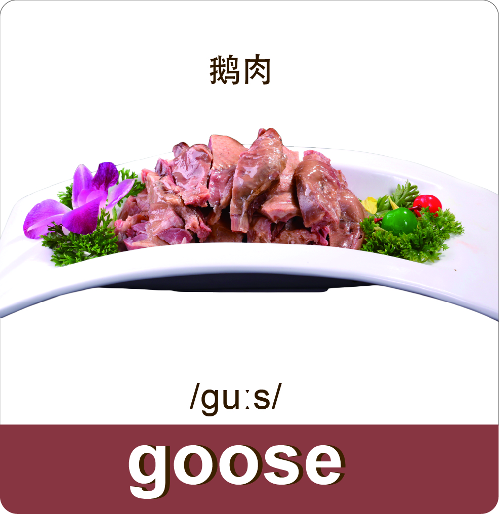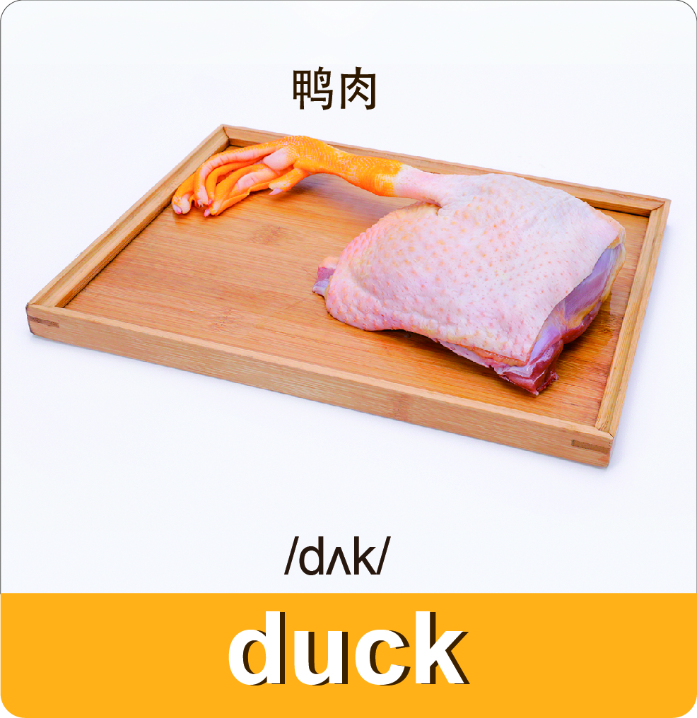 肉类词汇是菜单的重要组成部分,除了鸡肉、鸭肉、牛肉、猪肉等,还有不同的部位词汇,比如腿肉、胸肉和内脏等。即使掌握了翻译的方法,若没有足够的词汇量也无法顺利理解英文菜单及菜谱。本单元需要同学们熟记常见的肉类及肉类部位的词汇。