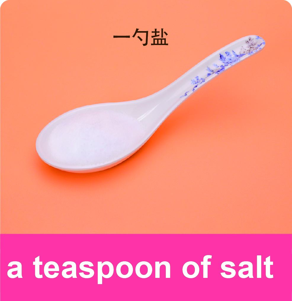 在食谱里,表达调味品的数量涉及到量词(measure words)。中文与英文的量词用法有很大的不同,中文里表达数量的结构是数词+量词+名词,比如“一杯水”、“三个面包”、“五块黄油”;在英文里,很多情况下表达数量时可在可数名词前加上数词,比如“2 eggs”和“3 burgers”。不可数名词则使用量词词组表达,比如“a jar of milk(一罐牛奶)”,“2 pounds of beef(两磅牛肉)”,还常常用英文缩写表达——比如“ 8oz steak”和 “2c butter”等,外行人看了简直摸不着头脑。因此本单元特地学习英文食谱里涉及的一些常用的量词词汇。