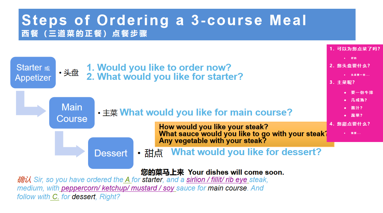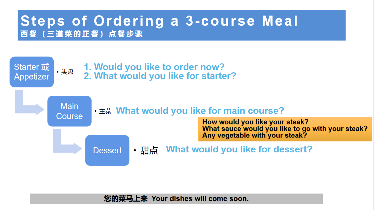确认:You have ordered ...(头盘), ... (主菜),...(甜点). Is that right?