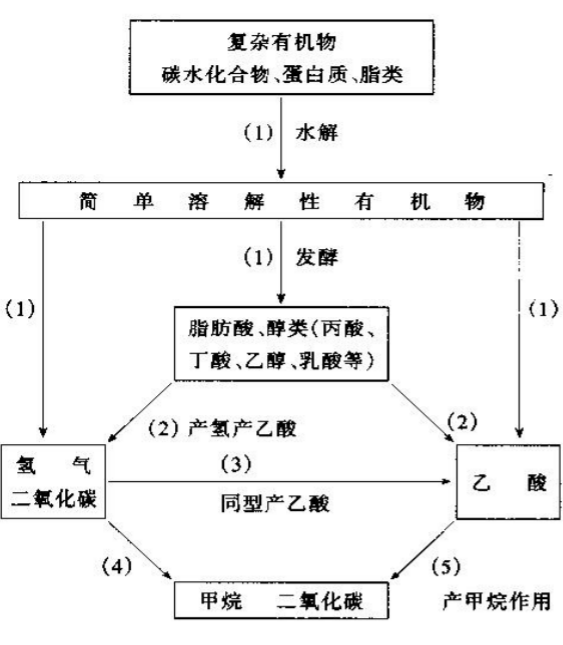 1.水解发酵阶段 2.产氢乙酸阶段 3.产甲烷阶段 4.同型产乙酸阶段