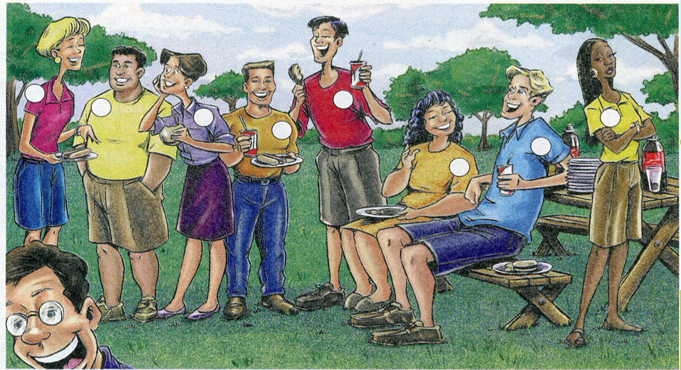 Patricia is at a company picnic.She's describing four people to her husband. Please Number the person she described in the picture.