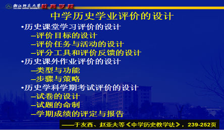(3)结合相关教学案例,着重讲授历史学业评价的设计,分历史课堂学习评价的设计、历史课外作业评价的设计和历史学科学期考试评价的设计。