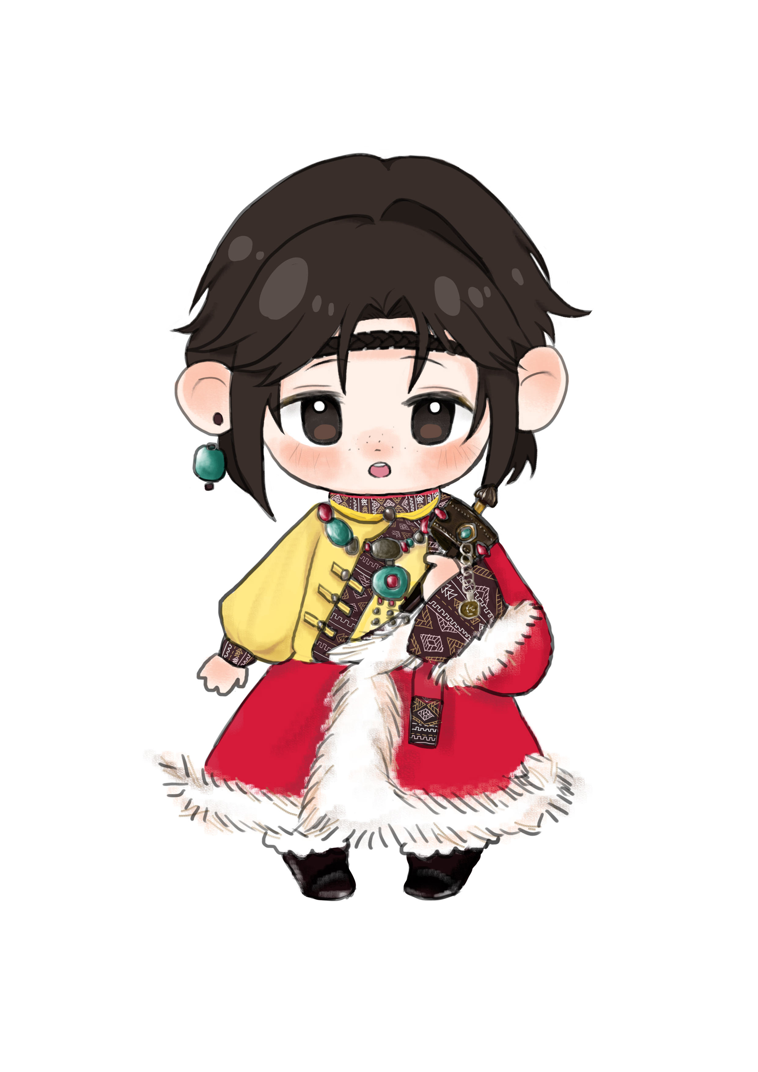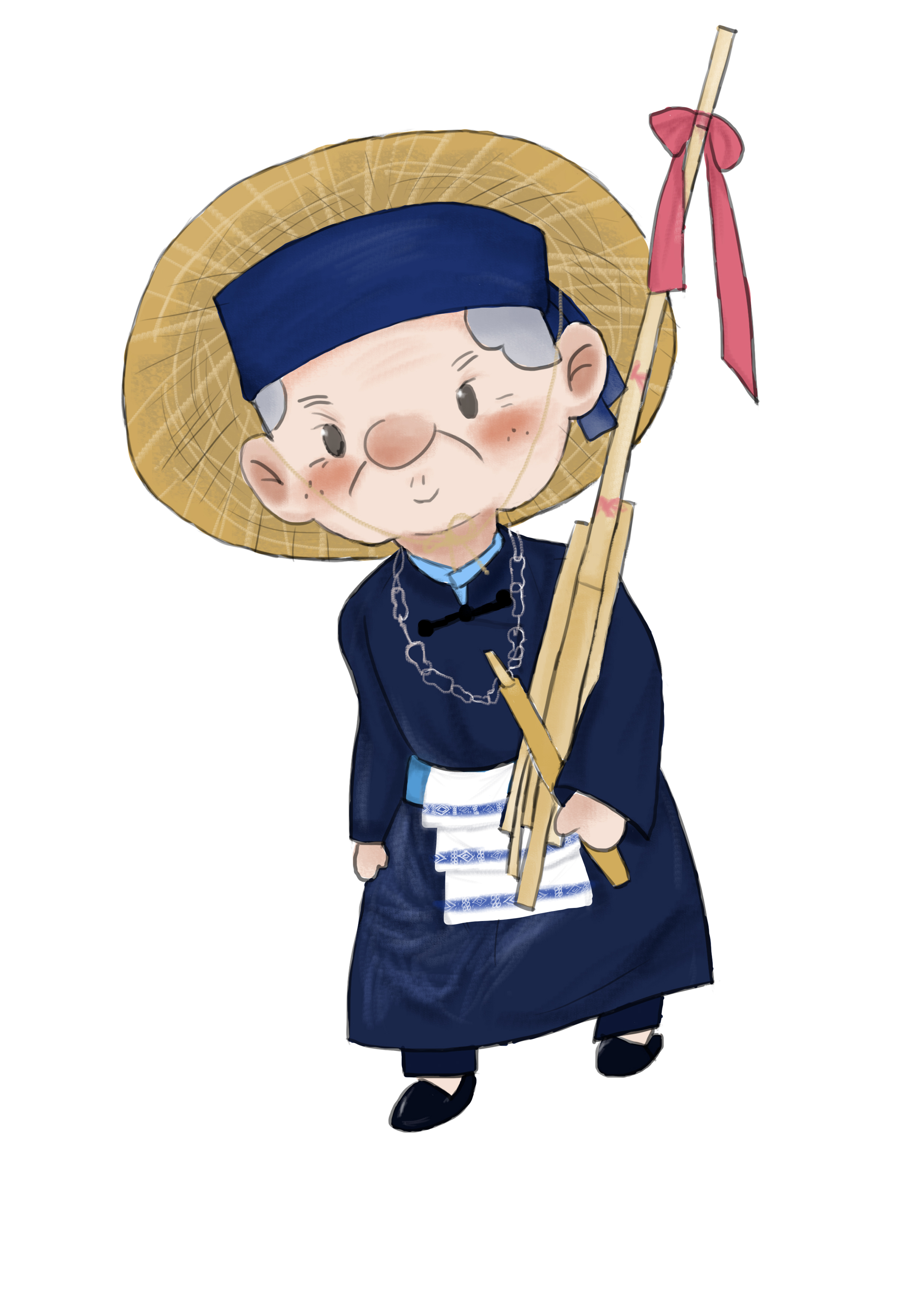 苗族相比其他民族的文化底蕴和历史演变更多,参考了一些摄影图片后,选择了一位老爷爷作为角色。苗族的男装相比于女装虽然没有那么艳丽,但是多以黑,白,青为主,仍然富有简洁大方之美。爷爷手中是苗族的特色乐器之一,芦笙。逢年过节,苗族人民会举行各式各样的芦笙会,吹起芦笙跳起舞。场面壮观热闹,充满了节庆气息。