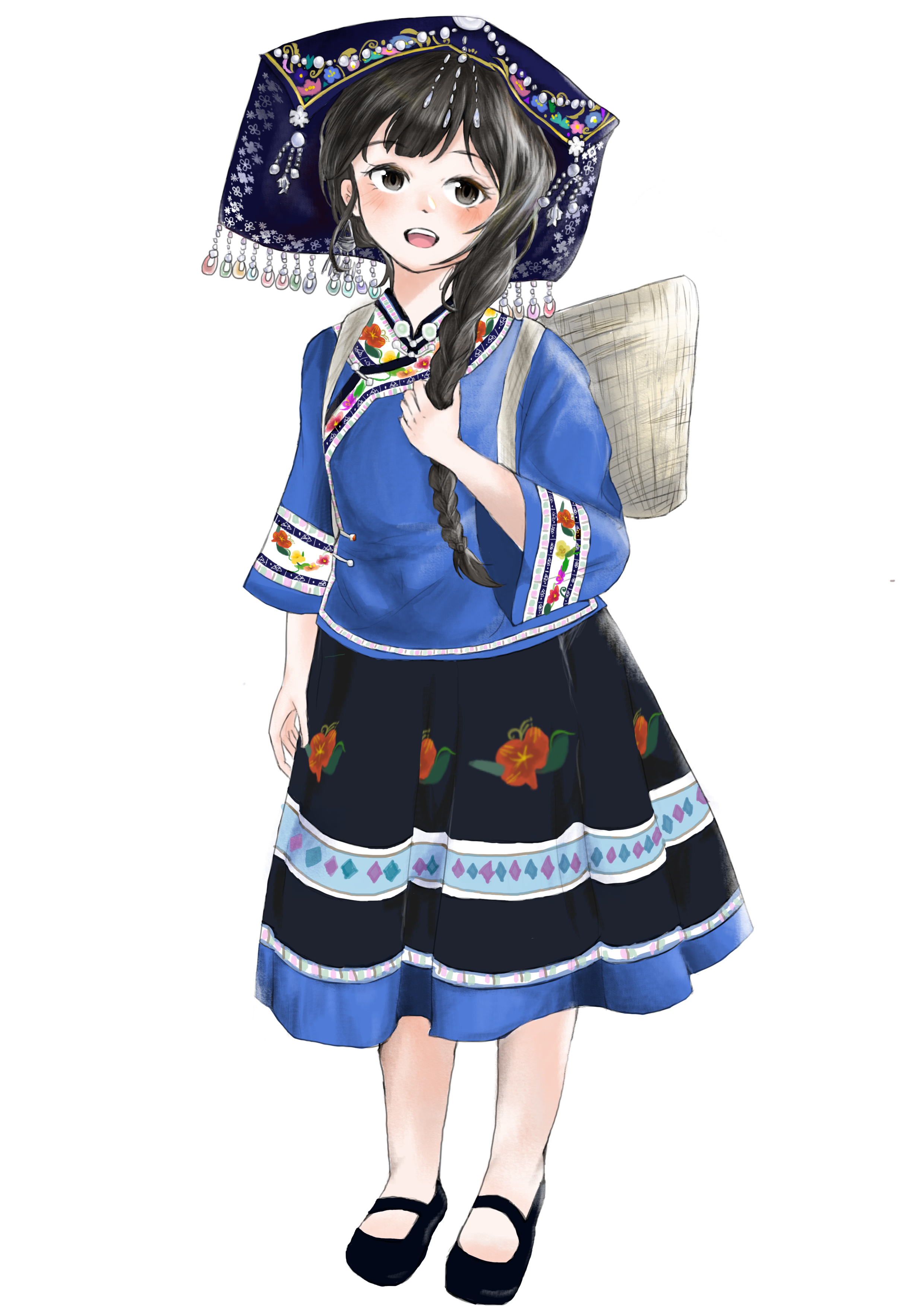 选择了少女作为主体,短衣长裙,头巾和衣着上有绣花等图案,在领口袖口以及长裙下摆处均有精美的纹样,除此之外,还佩戴了一些银饰等,作为少数民族的一大特色,也是服装的亮点。走起路来风流飘逸。绣花颜色鲜艳,与衣服的主色形成对比,凸显少女天真烂漫的形象,展现正值美好年华的活力与生机。