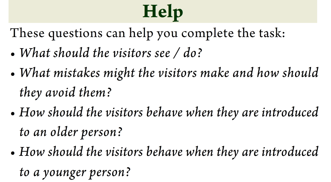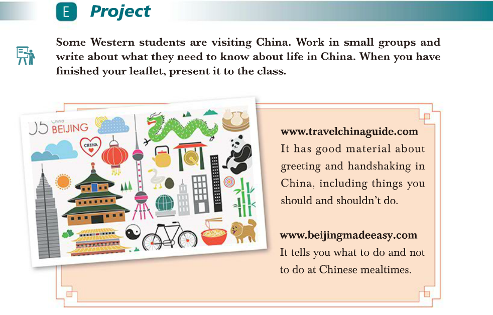 In group of Two or Five, make an introduction to your hometown or a city/food/folk custom you are interested in China with PPT or Video.