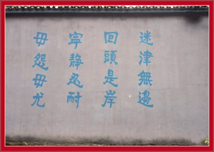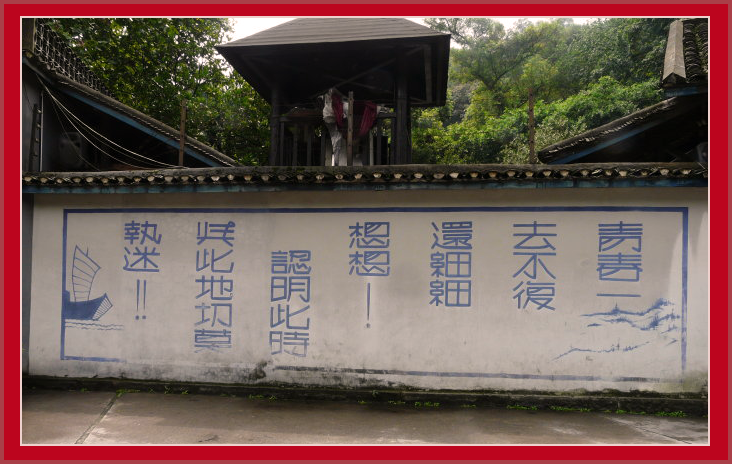 渣滓洞看守所分内外两院,内院有一放风坝,16间男牢,2间女牢。内院墙上写“青春一去不复还,细细想想”“认明此时与此地,切莫执迷”“迷津无边,回头是岸”“宁静忍耐,毋怨毋忧”等标语。
