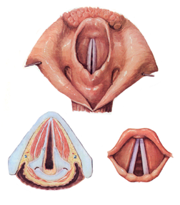 喉腔侧壁上有两对黏膜皱襞,上方一对为前庭襞,两襞间为前庭裂;下方一对为声襞,两侧声襞及杓状软骨底部之间为声门裂,为喉腔最狭窄部位。声门裂前2/3为膜间部,后1/3为软骨间部。 声门裂膜间部平静呼吸时呈三角形,深呼吸时呈菱形,发声时呈窄裂隙状。
