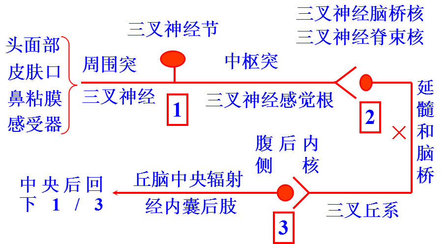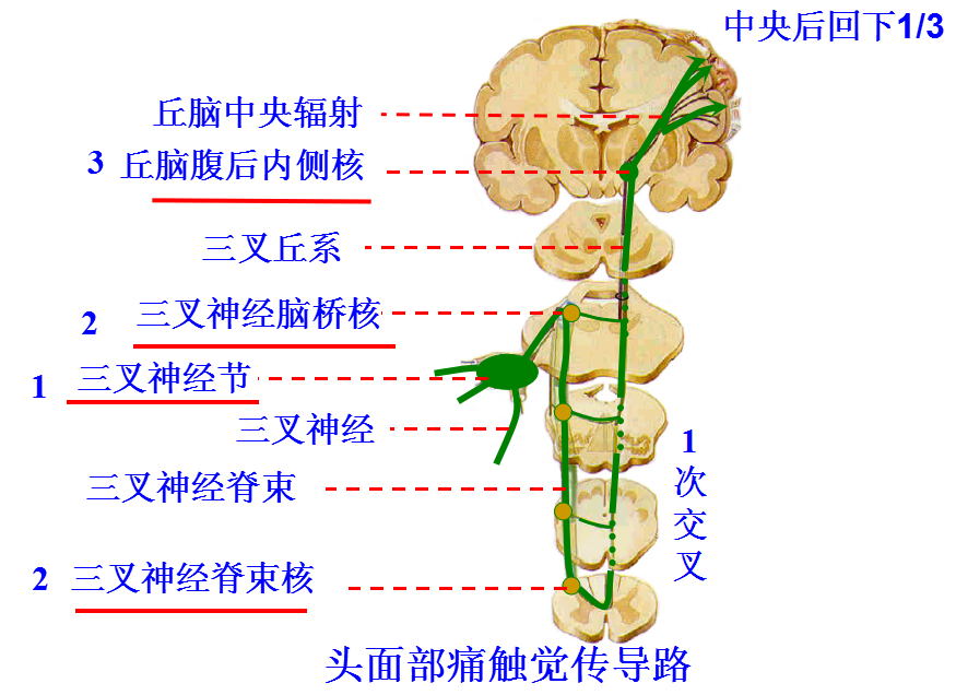 头面部痛触觉传导路:三级神经元,一次交叉