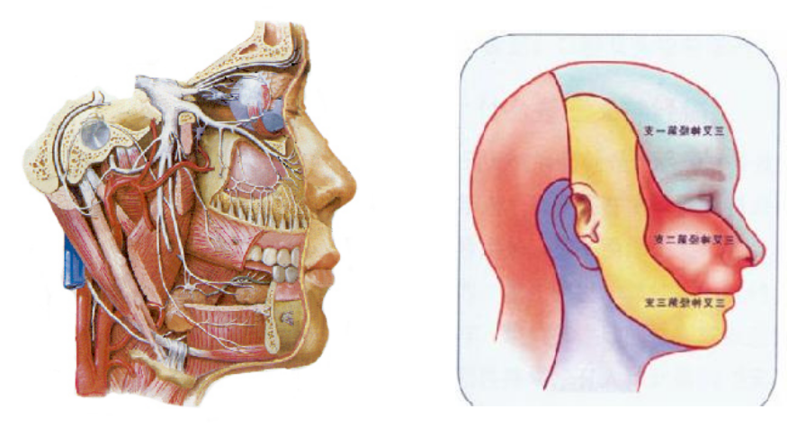 三叉神经分布:头面部皮肤、鼻腔、口腔黏膜、牙齿