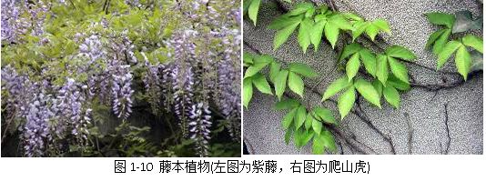 ①缠绕类:依靠茎在其它植物或物体上的缠绕,而不断向上生长。缠绕方向有顺时针、也有逆时针方向的。园林中常见种类有:葛藤、紫藤(图1-10左图)等;