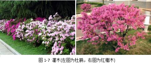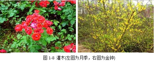 灌木根据其有无主干可以分为两种类型:一类是树体矮小(<6m)、主干低矮,如玫瑰、杜鹃、牡丹、小檗、黄杨等(图1-7,图1-8);另一类树体矮小,无明显主干,茎干自地面生出多数,而呈丛生状,又称丛生灌木类,如绣线菊、千头柏等。