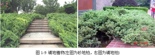 铺地类植物实际上是灌木,但其形态比较独特,枝干均铺地生长,与地面接触部分生出不定根,是园林中比较独特的一类植物,如铺地柏、砂地柏(图1-9)等。