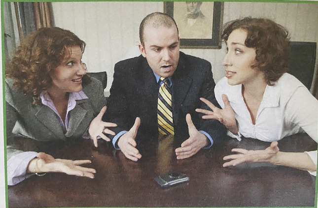 | Two of the participants seem to have got together before the meeting and keep arguing very strongly for the same point. |