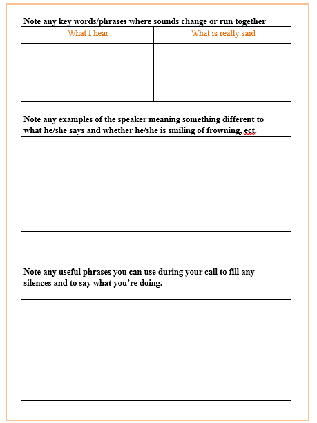 1.当你在电话沟通中说英语和听英语时,注意语音变化或连续给理解造成困难的词汇。使者记住这些困难点,以便下次能轻易地说出来或听出来。你可以将之记录在76页的框架里。