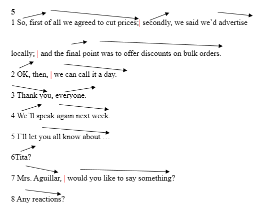 | 1 Summarizing what has been said 2 Signalling the end of the call3 Thanking the participants 4 Referring to the next contact 5 Promising action | a Thank you ,everyone. b We’ll speak again next week c I’ll let you all know the outcome. d So, first of all we agreed to…; secondly, we said…;and the final point was… e Ok, then, we can call it a day. |