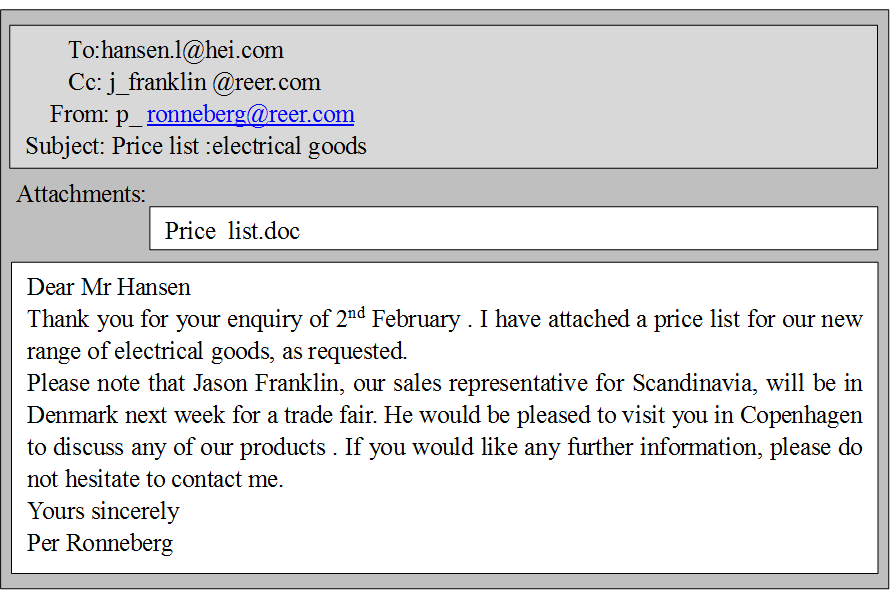 1 Make sure you have the _____’s e-mail address correct. It’s easy to send an e-mail to the wrong person! 2 Use the _____ only if someone else needs to be kept informed or to take action. 3 Include the following information in your ______ : your name, job title, company name and address, telephone number. 4 The company’s website address and a legal _____ are sometimes automatically added to all outgoing messages. 5 Ensure the _____ clearly describes what the e-mail is about and is free of errors. 6 Do not use Reply all unless you mean to e-mail the whole group. 7 Use the body of the e-mail if possible.If you do need to send an _____, first check with the receiver that the format(Word, etc,) and fiel size are appropriate. 8 Use the bcc field instead of the ______field to avoid having large numbers of names in the e-mail header, and to avoid making e-mail addresses known to other people. 9 Only use the _____ (high priority) if your e-mail requires quick action, or if others need to receive information from you urgently. 10 Don’t forward e-mails unless the sender has given you permission. |