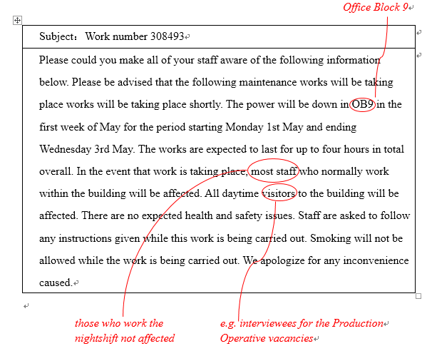 To:all-staff@hv.co.uk From:p-green@hv.co.uk Subject:Internal vacancy ----------------------------------------------------------------------------------------------------------- From September 7th there will be a vacancy at the Birmingham office for a marketing assistant. The successful applicant will have good communication and secretarial skills (60wpm). The starting salary for the post will be £15 K p.a. Interested members of staff should e-mail their CV to Steve Higgins at Best regards Peter green |