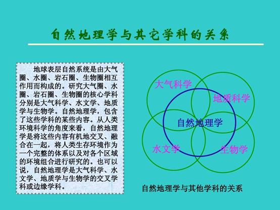 地球表层自然系统是由大气水圈、岩石圈、圈、水圈、岩石圈、生物圈相互作用而构成的。研究大气圈、作用而构成的。研究大气圈、水岩石圈、圈、岩石圈、生物圈的核心学科分别是大气科学、水文学、分别是大气科学、水文学、地质学与生物学。自然地理学,学与生物学。自然地理学,包含了这些学科的某些内容。了这些学科的某些内容。从人类环境科学的角度来看,环境科学的角度来看,自然地理学是将这些内容有机地交叉、学是将这些内容有机地交叉、融合在一起,合在一起,将人类生存环境作为一个完整的体系以及对各个区域的环境组合进行研究的。的环境组合进行研究的。也可以自然地理学是大气科学、说,自然地理学是大气科学、水文学、文学、地质学与生物学的交叉学科或边缘学科。