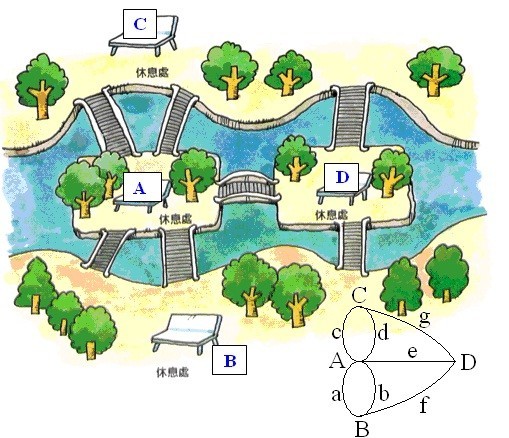 哥尼斯堡是欧洲一个美丽的小城,有一条河横贯其中,河中间有两座岛,连接岛和岸有七座桥,人们经常在此散步。有一天,有人提出这样的问题:能否不重复的走遍这七座桥?于是,人们进行了各种尝试,发现不是一座桥走了两遍,就是有的桥没有走过。有人说这样的路线不存在,也有人说这样的路线存在只是一时还没有找到,就在大家莫衷一是时,人们想到了可以写信求助大数学家欧拉。欧拉收到这封信,发现这个问题用已有的数学方法是不能解决的,于是研究采用了新的方法,一举解决了这个问题,并开启了“图论”这一数学分支。