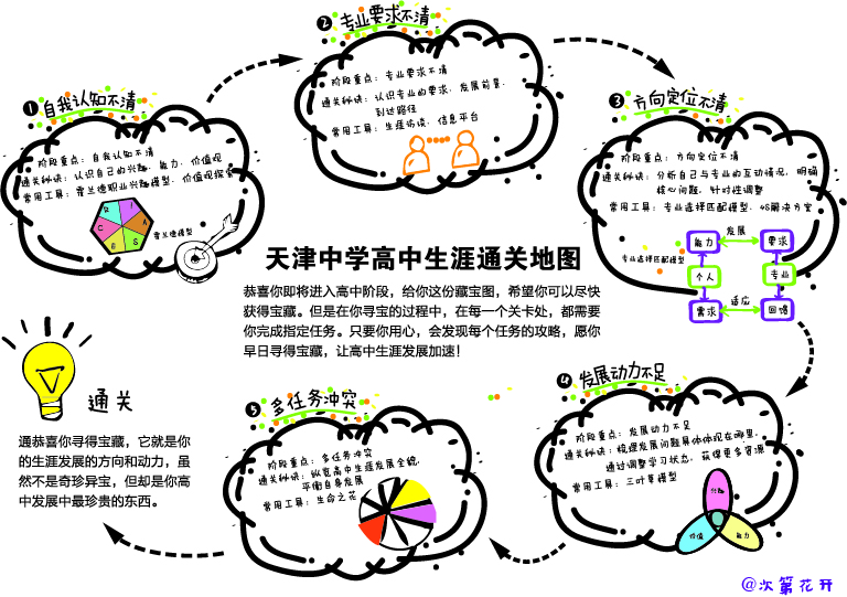 根据高中学习的实际,我们设计了天津中学高中生涯通关地图,明晰了高中阶段生涯发展的五个阶段,呈现了各阶段的主要任务及解决办法。