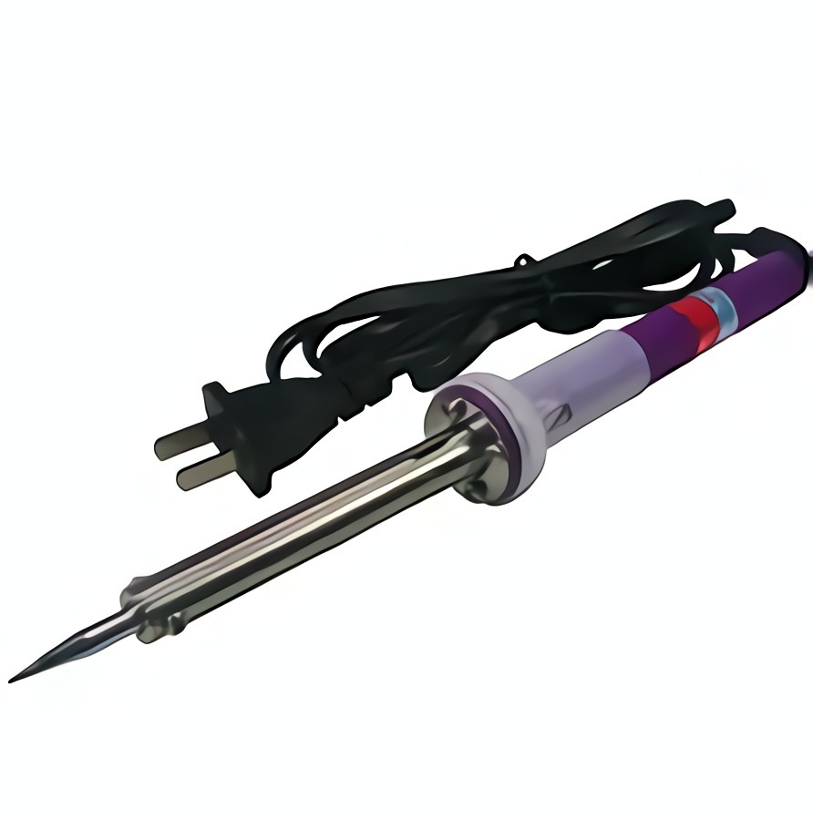 电烙铁主要用于焊接元件及导线,工作温度相对较高,在使用前同样需要通电并预热3-5分钟。在使用时应右手持电烙铁,左手用尖嘴钳或镊子夹持元件或导线,在烙铁头刃面粘上一定量的焊锡并将刃面紧贴在焊点处,电烙铁与水平面大约成60℃角以便于熔化的锡从烙铁头上流到焊点上,烙铁头在焊点处停留的时间控制在2~3秒钟然后抬开烙铁头,在焊点处的锡冷却凝固方可松开左手;在使用完毕后,同样应及时断电并将电烙铁放在支架上充分冷却,以防止事故的发生。