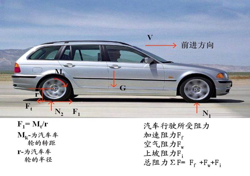 汽车的驱动力F1须克服驱动轮本身所遇到的滚动阻力,由车架经从动前悬架传给从动桥,使从动车轮克服其滚动阻力;另外通过驱动桥、驱动后悬架传给车架,最后经车身克服空气阻力、坡道阻力、加速阻力。只有当驱动力足以克服上述各种阻力之和时,汽车才能保持前进。