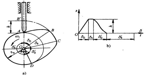 a)对心移动尖顶从动件盘形凸轮机构 b)位移曲线图