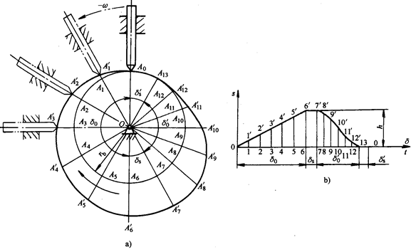 c)自OB0沿-ω1方向,在基圆上取δ0、δs、δ0ˊ、δsˊ,并将推程运动角和回程运动角各分成与图4-23b横坐标上的等分数相同的若干等分(图中δ0为6等分,δ0ˊ为6等分),得A1、、A2、、A3、……等各点,则OA1、OA2、 OA3、……这一系列向径线的延长线,便是反转后从动件在导路中心线相应的各个位置;