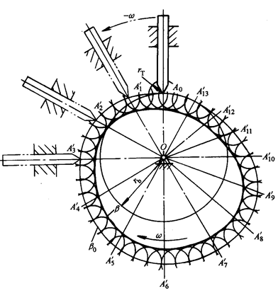 在曲线β0上任取一系列的点作为圆心、以滚子半径 rT 作为半径画一系列的圆,再作这些圆的包络线β。β 即是所求凸轮的实际轮廓线(工作轮廓线)。由作图过程可知,rb是指理论轮廓线的基圆半径。