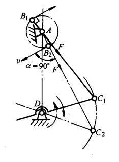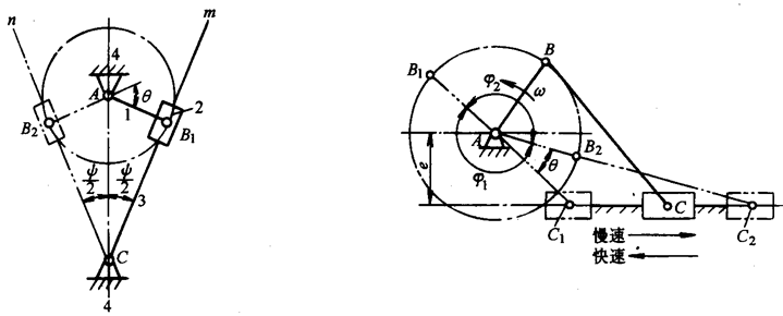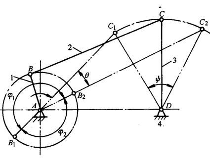 如图2-56所示的曲柄摇杆机构,原动件曲柄1在转动一周的过程中,有两次与连杆2共线(即为AB1C1,AB2C2)。此时,摇杆3分别处于C1D和C2D两个极限位置。摇杆在两个极限位置间的夹角称为摇杆的摆角ψ;而曲柄与连杆两共线位置间所夹的锐角,称为极位夹角θ。