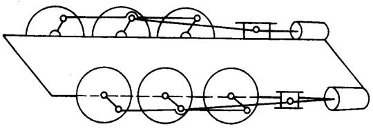 对于机械的运动,死点位置会使从动件处于静止或运动方向不定的状态,因而需设法加以克服,工程上常借飞轮,将机构带过死点位置。如发动机曲轴上安装飞轮,能使曲轴保持连续转动;也可采用相同机构错位排列的方法来渡过死点位置,如图2-63所示的机车两边的车轮联动机构,就是利用错位排列的方法,使两边机构的死点位置互相错开,即利用位置差来顺利通过各自机构的死点位置。