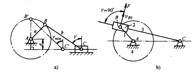 a) 曲柄滑块机构的γmin的位置 b) 导杆机构的γmin的位置